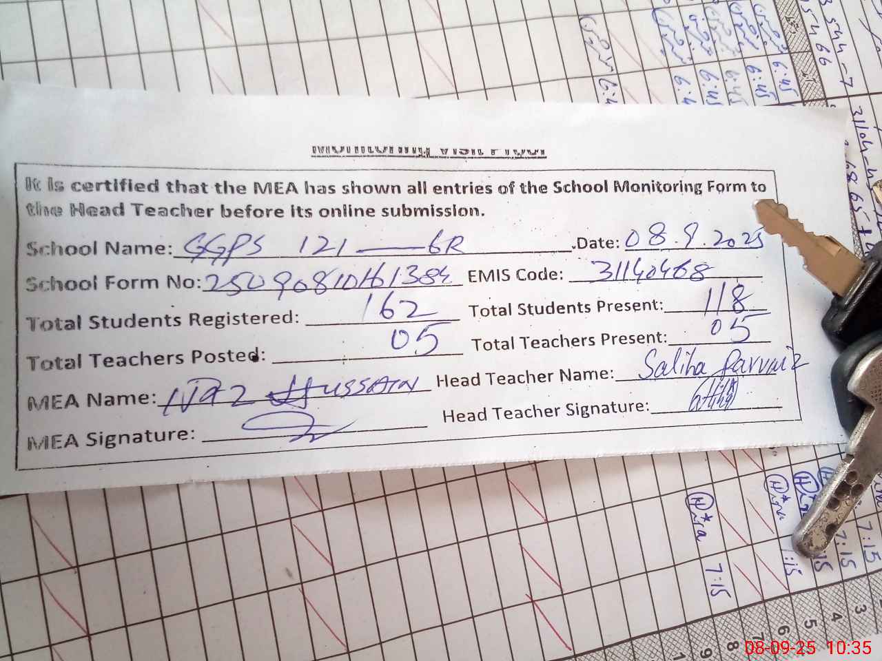 | Attendance Register | Head Teacher | MEA with School | Visit Proof |