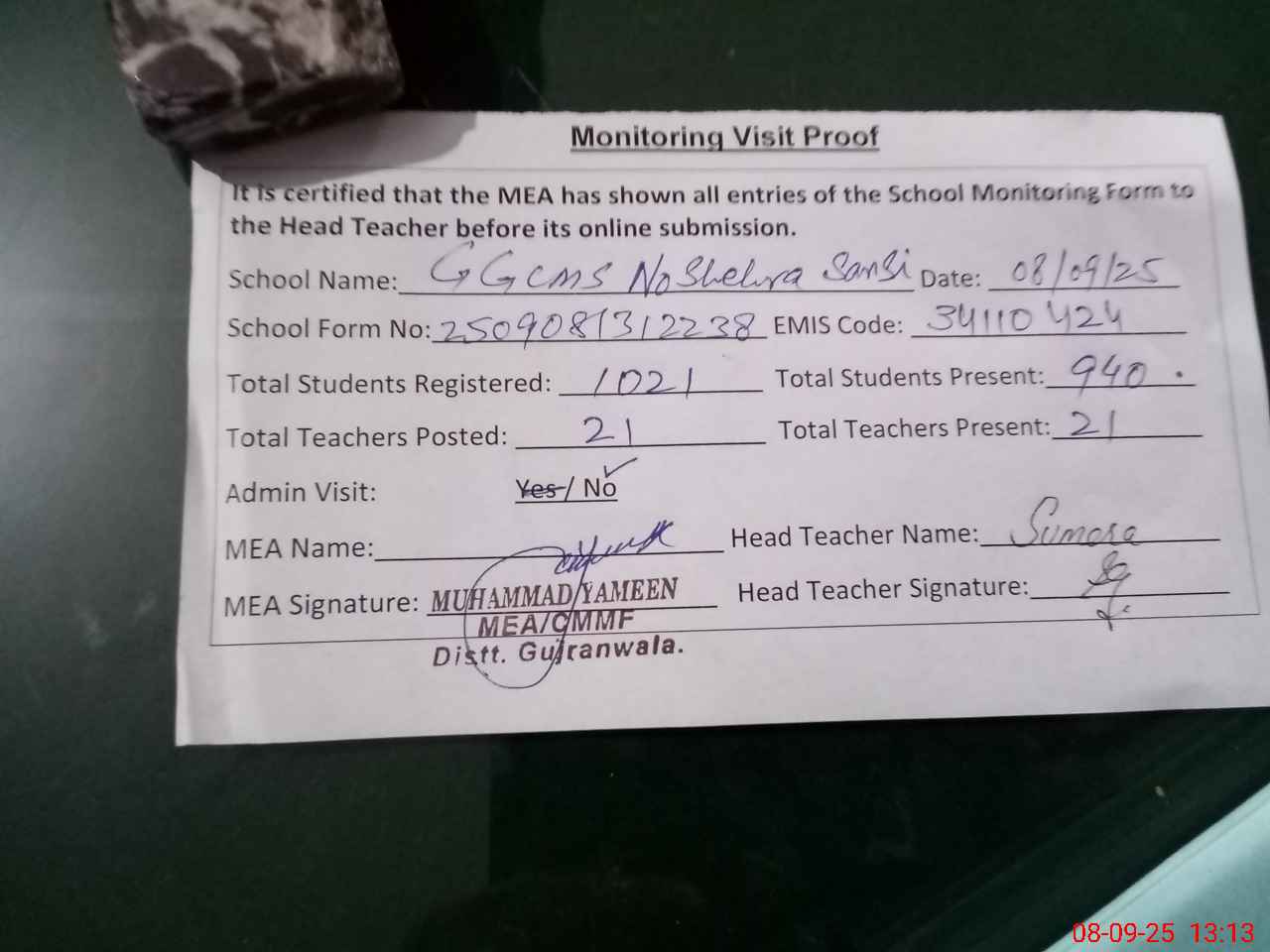 | Attendance Register | Head Teacher | MEA with School | Visit Proof |