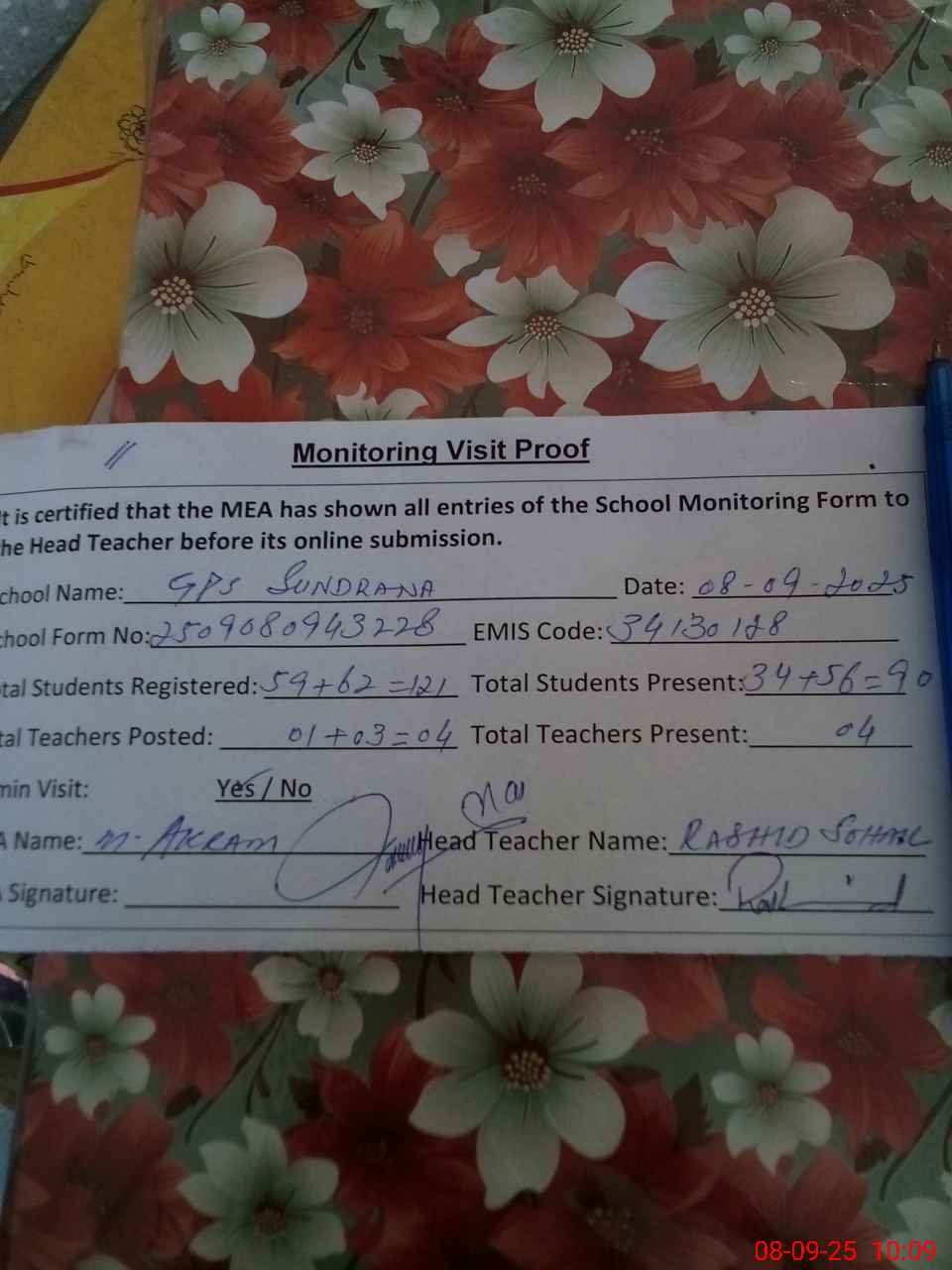 | Attendance Register | Head Teacher | MEA with School | Visit Proof |