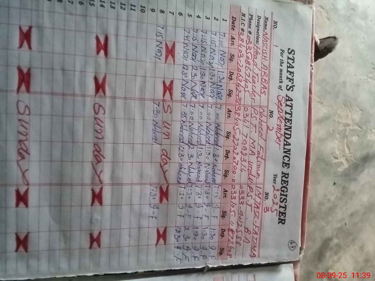 | CNIC | Full Name | Designation | R/C | Absence During Last Calender Month |