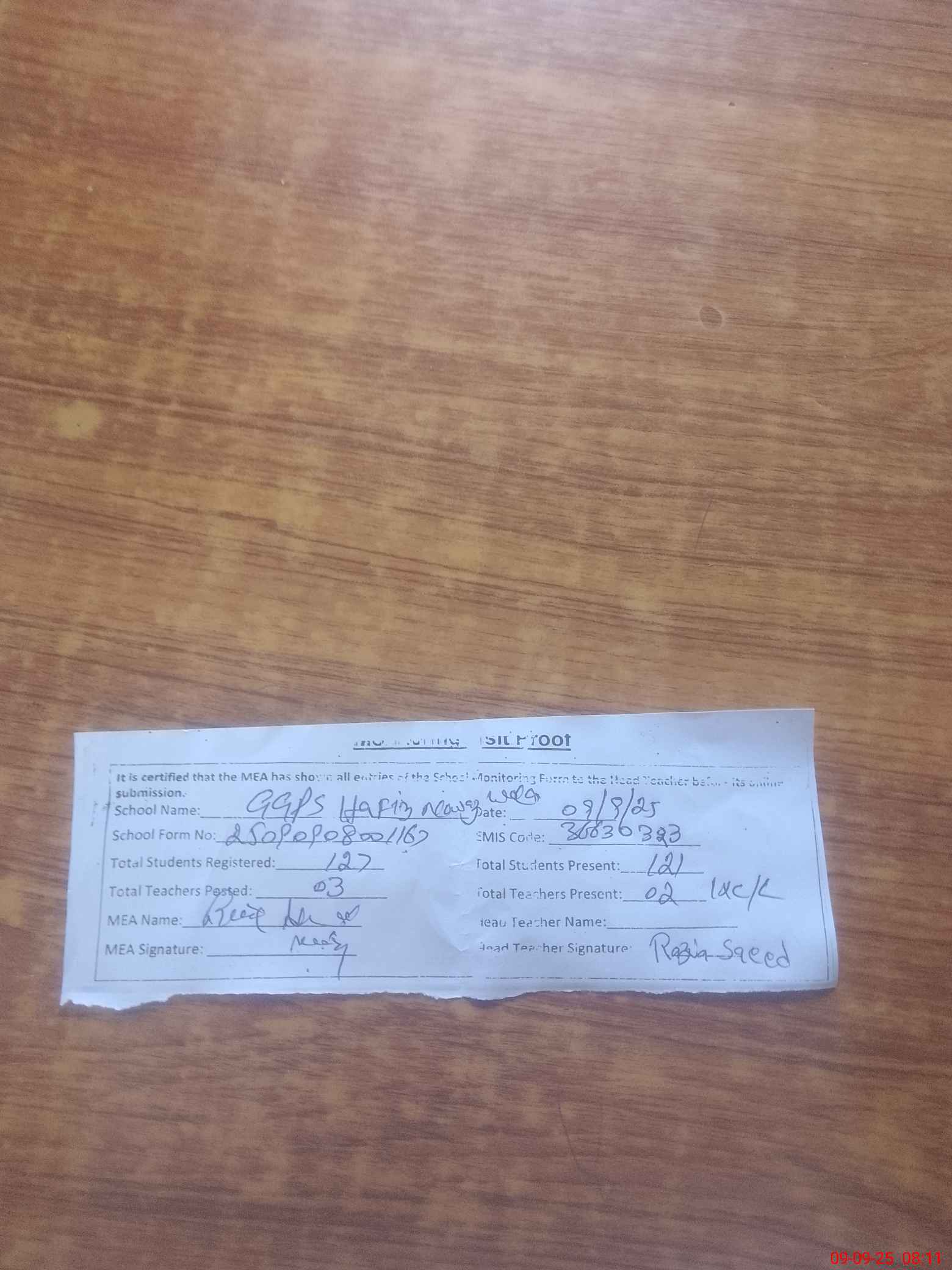 | Attendance Register | Head Teacher | MEA with School | Visit Proof |