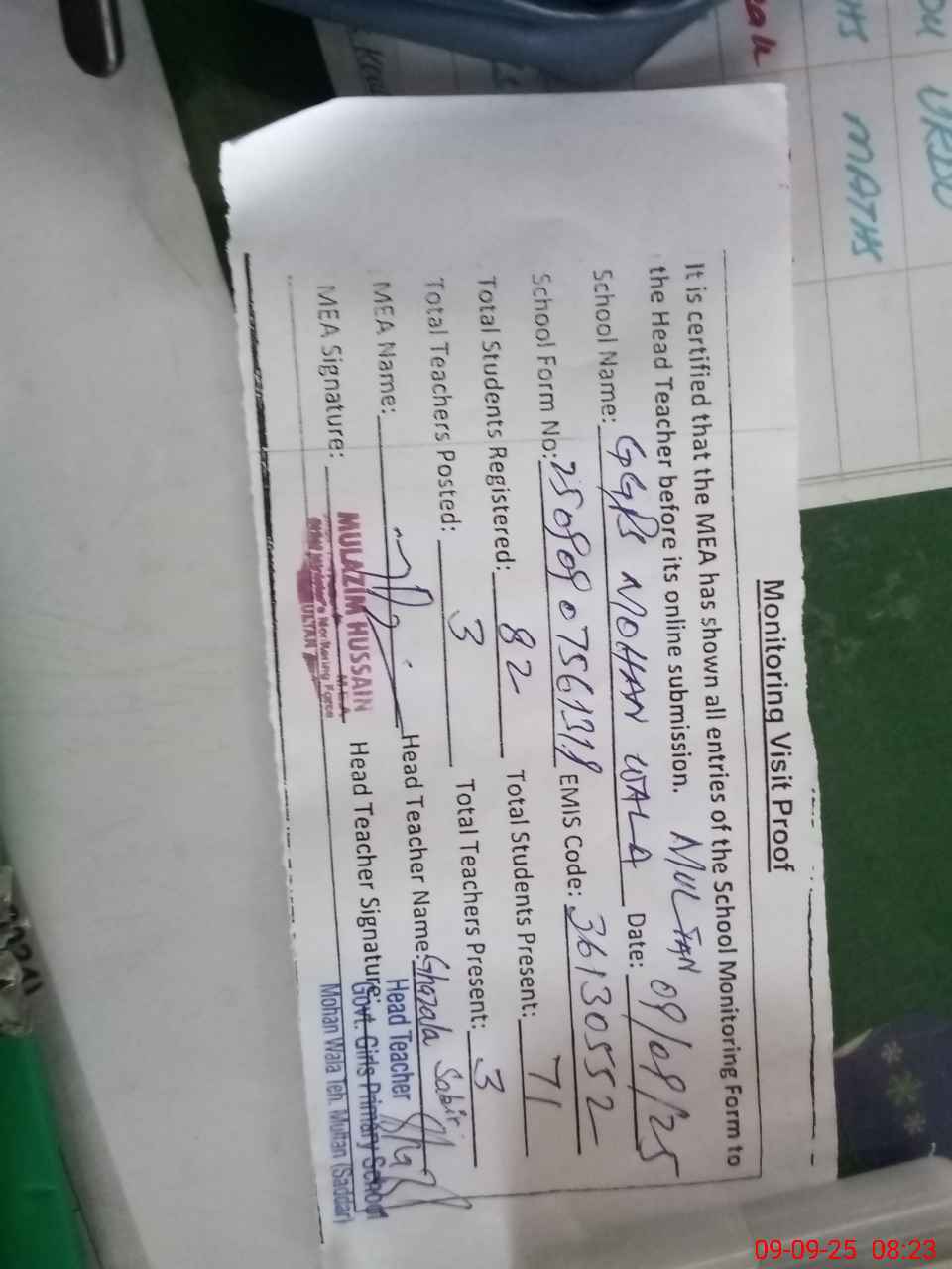 | Attendance Register | Head Teacher | MEA with School | Visit Proof |