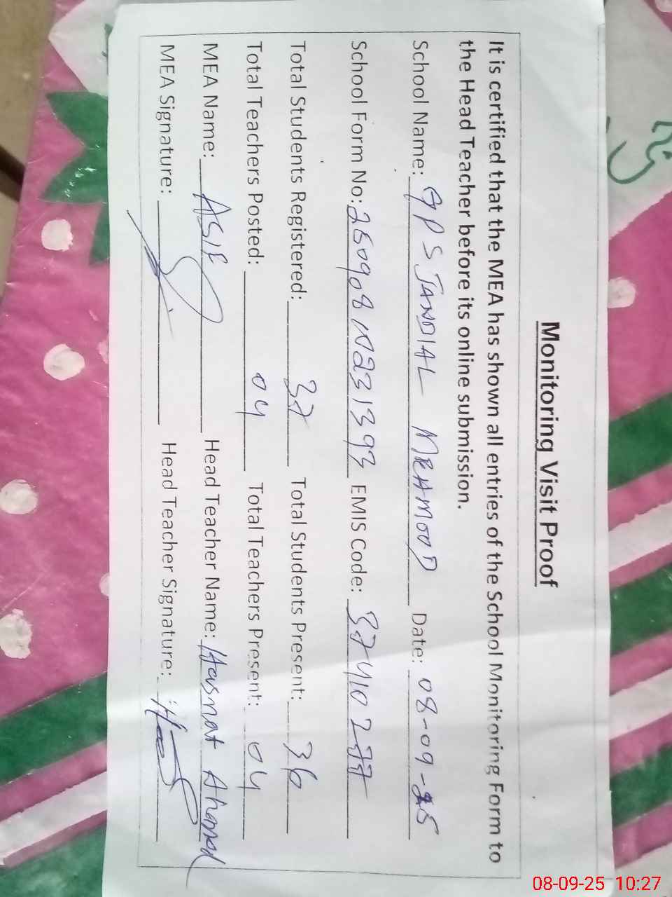 | Attendance Register | Head Teacher | MEA with School | Visit Proof |