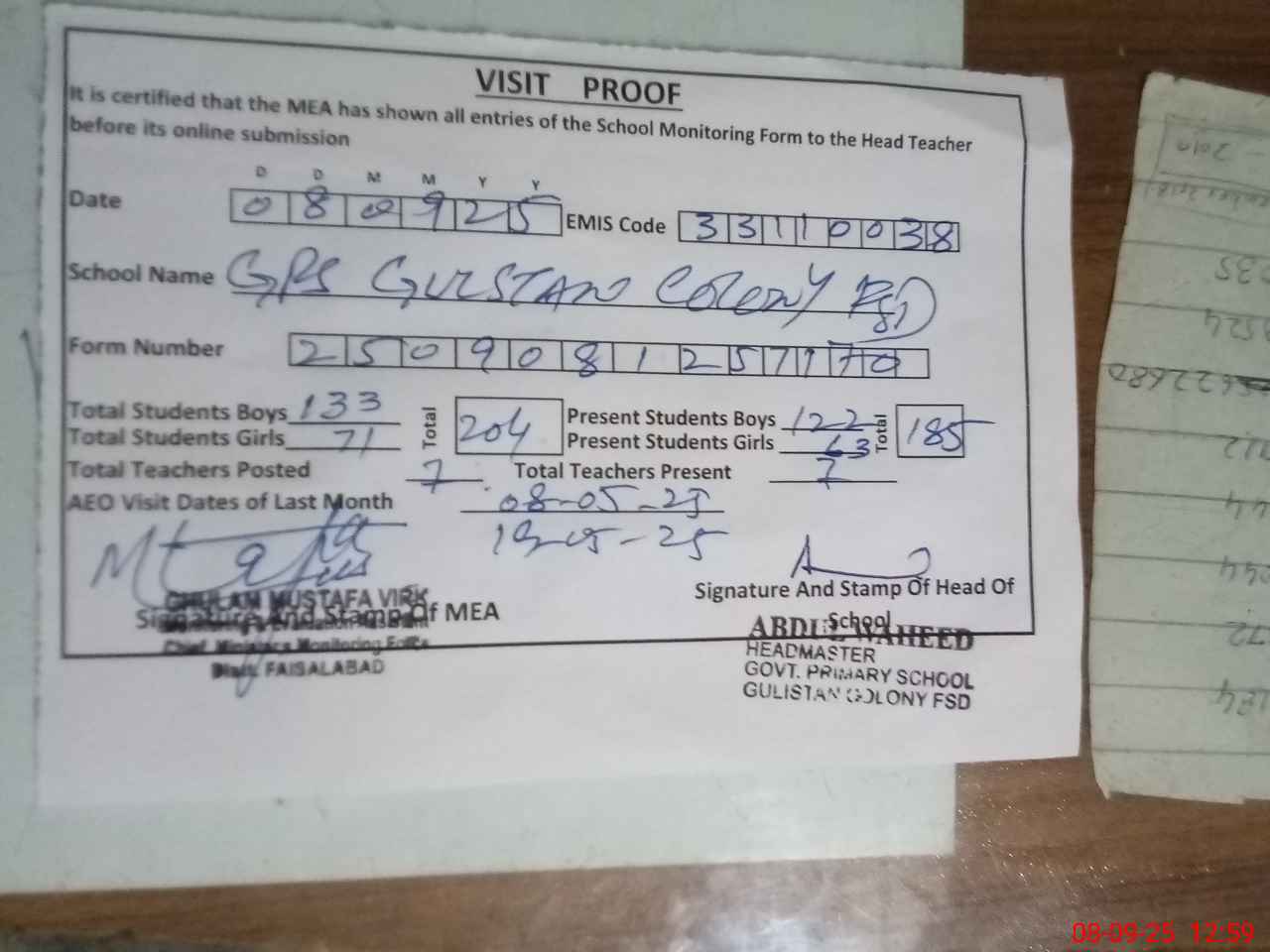 | Attendance Register | Head Teacher | MEA with School | Visit Proof |