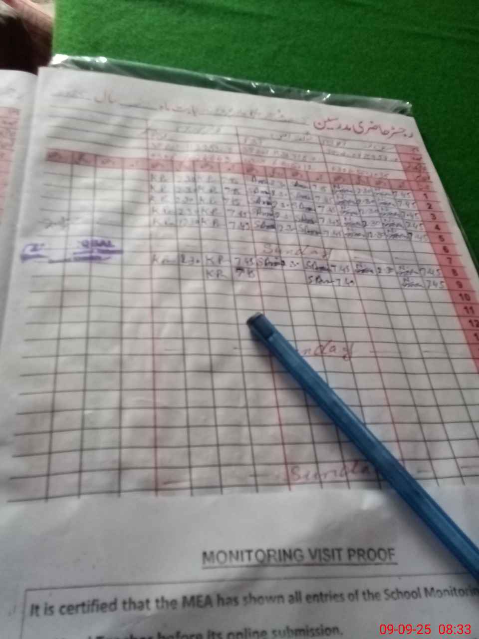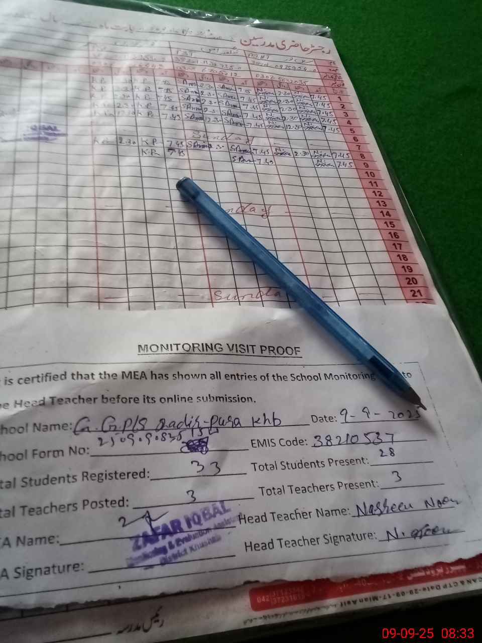 | Attendance Register | Head Teacher | MEA with School | Visit Proof |