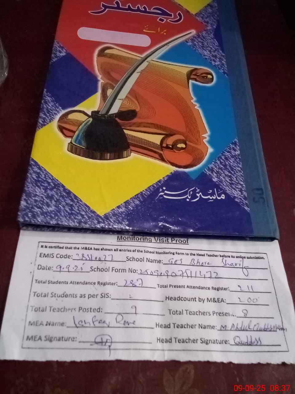 | Attendance Register | Head Teacher | MEA with School | Visit Proof |