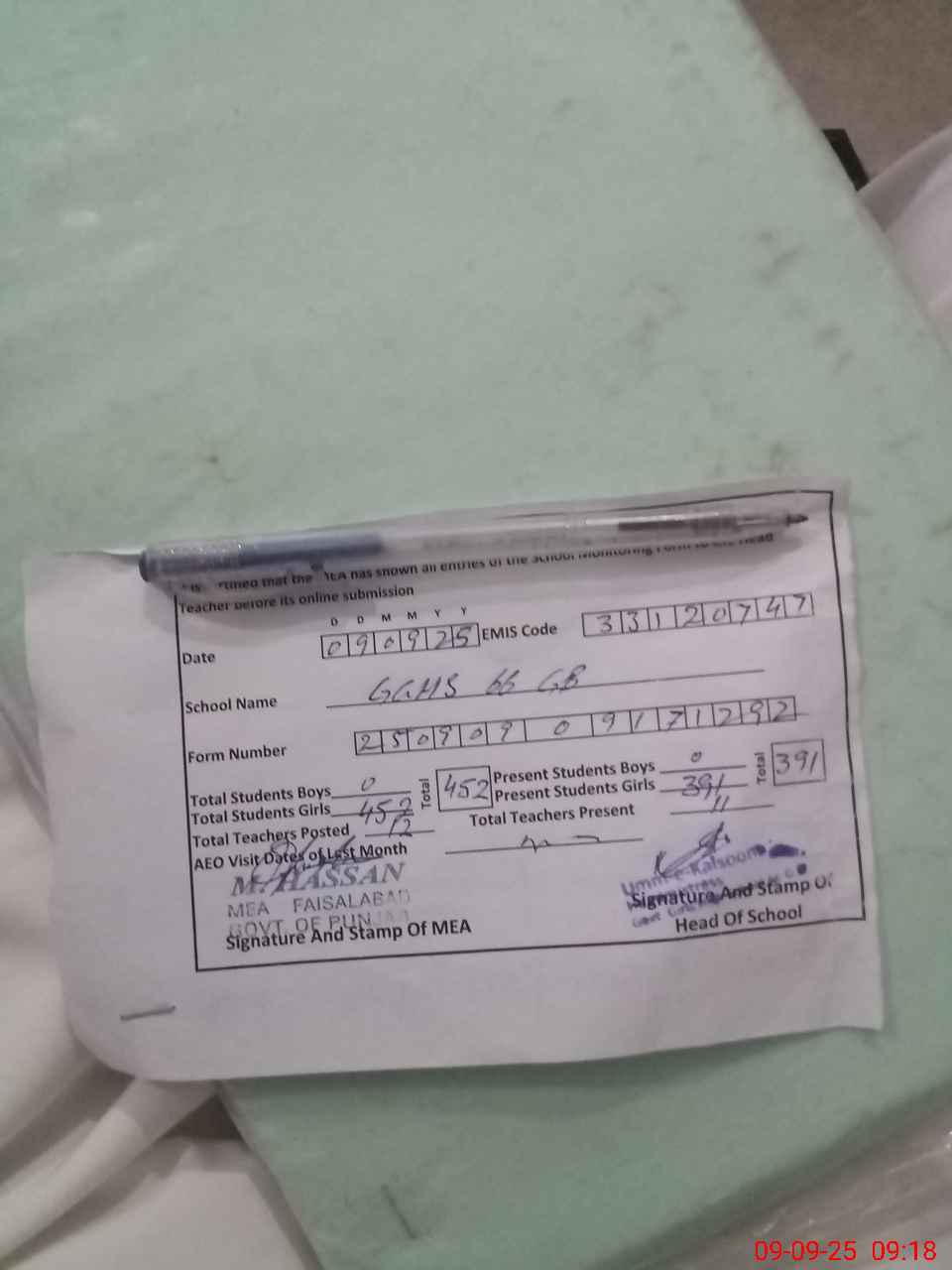 | Attendance Register | Head Teacher | MEA with School | Visit Proof |
