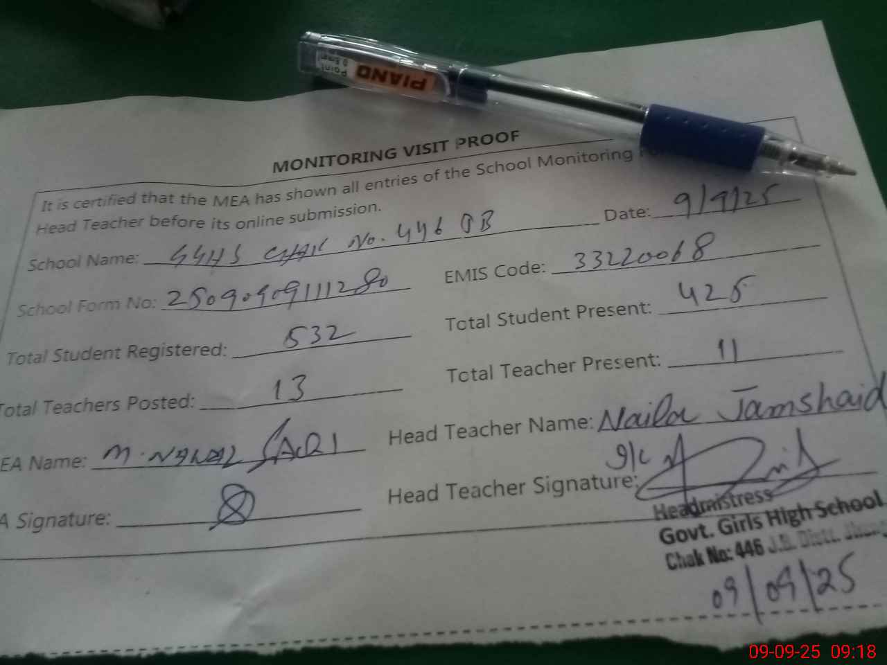 | Monitoring Date: 09-09-2025 | Start Time: 09-09-2025 08:33 AM | End Time: 09-09-2025 09:18 AM | Name of MEA: J-**** MU**** NA**** SA**** | |