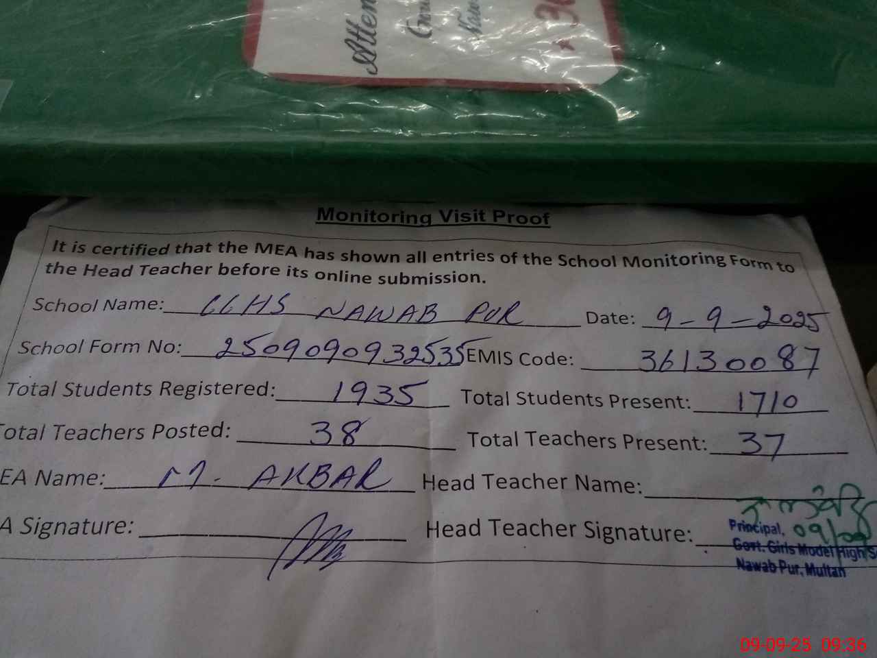 | Attendance Register | Head Teacher | MEA with School | Visit Proof |