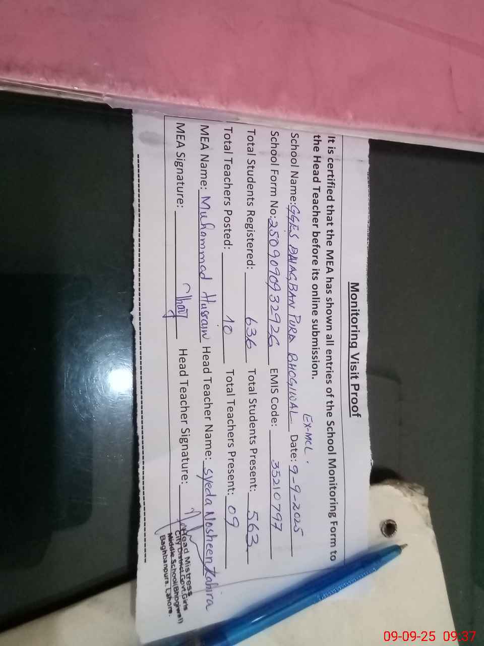 | Certified that this School was Inspected by the Undersigned MEA/DMO Today and the Information Stated Above is as Per Record. | |||||