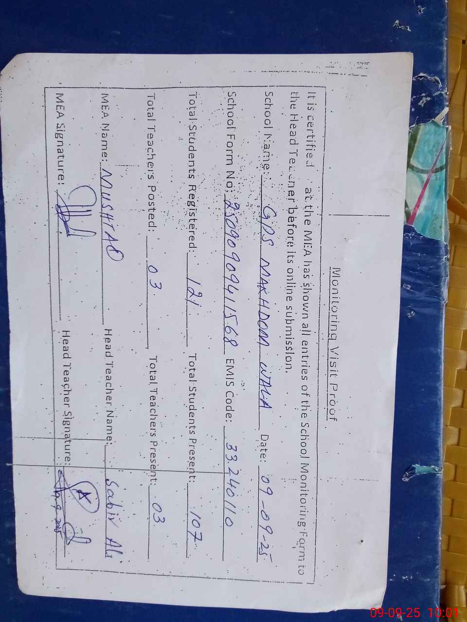 | Attendance Register | Head Teacher | MEA with School | Visit Proof |