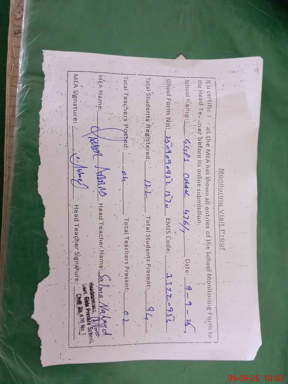 | Attendance Register | Head Teacher | MEA with School | Visit Proof |