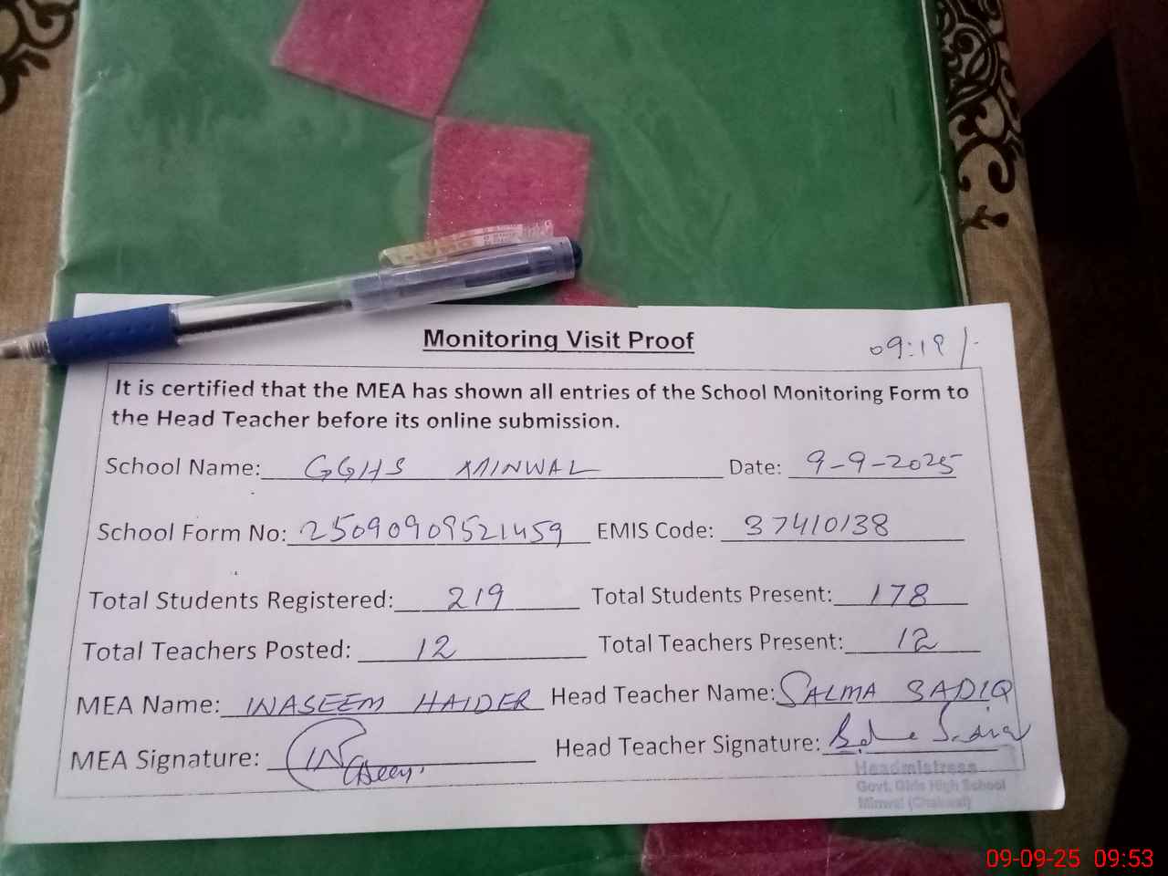 | Certified that this School was Inspected by the Undersigned MEA/DMO Today and the Information Stated Above is as Per Record. | |||||