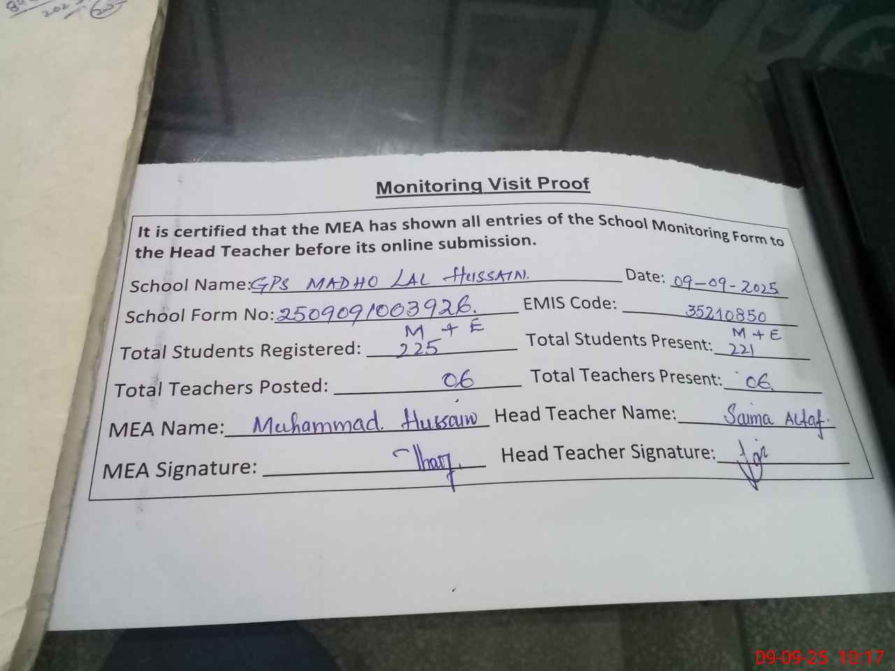 | Certified that this School was Inspected by the Undersigned MEA/DMO Today and the Information Stated Above is as Per Record. | |||||
