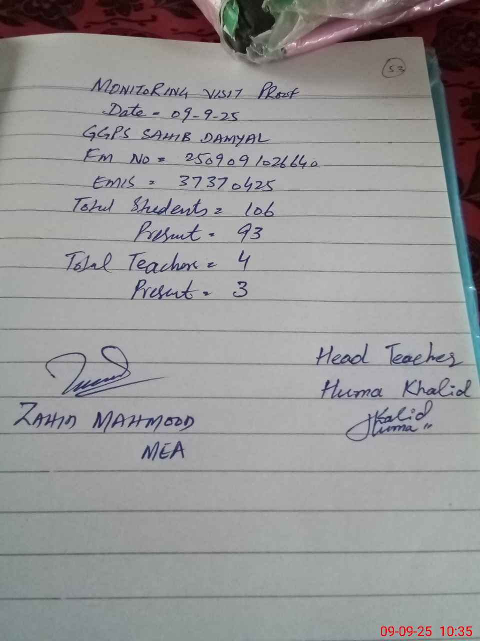 | Attendance Register | Head Teacher | MEA with School | Visit Proof |