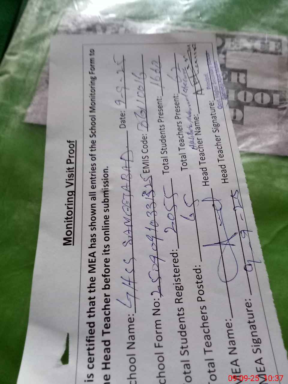 | Attendance Register | Head Teacher | MEA with School | Visit Proof |