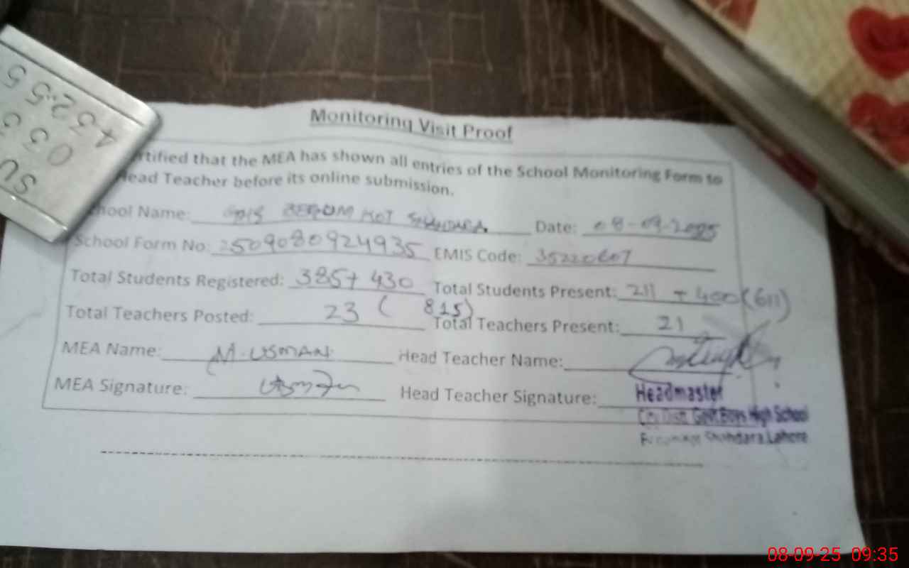 | EMIS Code: 35220607 | Name of School: GHS BEGUM KOT SHAHDARA (EX-MCL) | |||