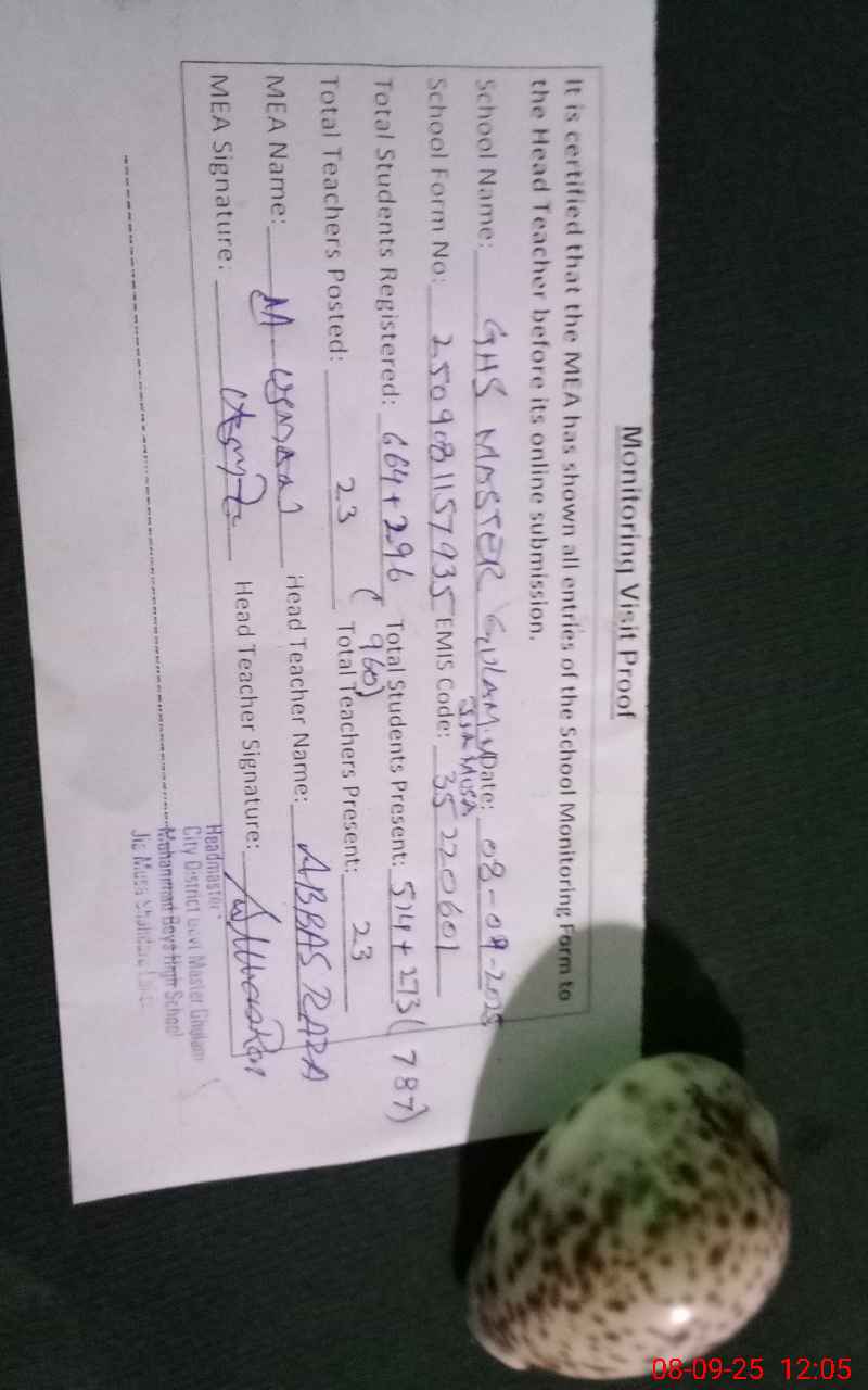 | EMIS Code: 35220601 | Name of School: GHS MASTER GHULAM MUHAMMAD JIA MUSA SHAHDARA (EX-MCL) | |||