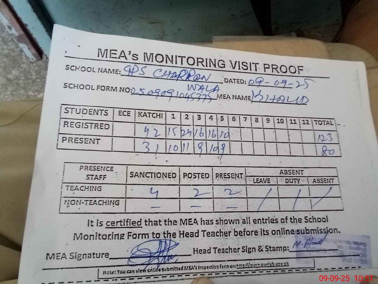| Attendance Register | Head Teacher | MEA with School | Visit Proof |