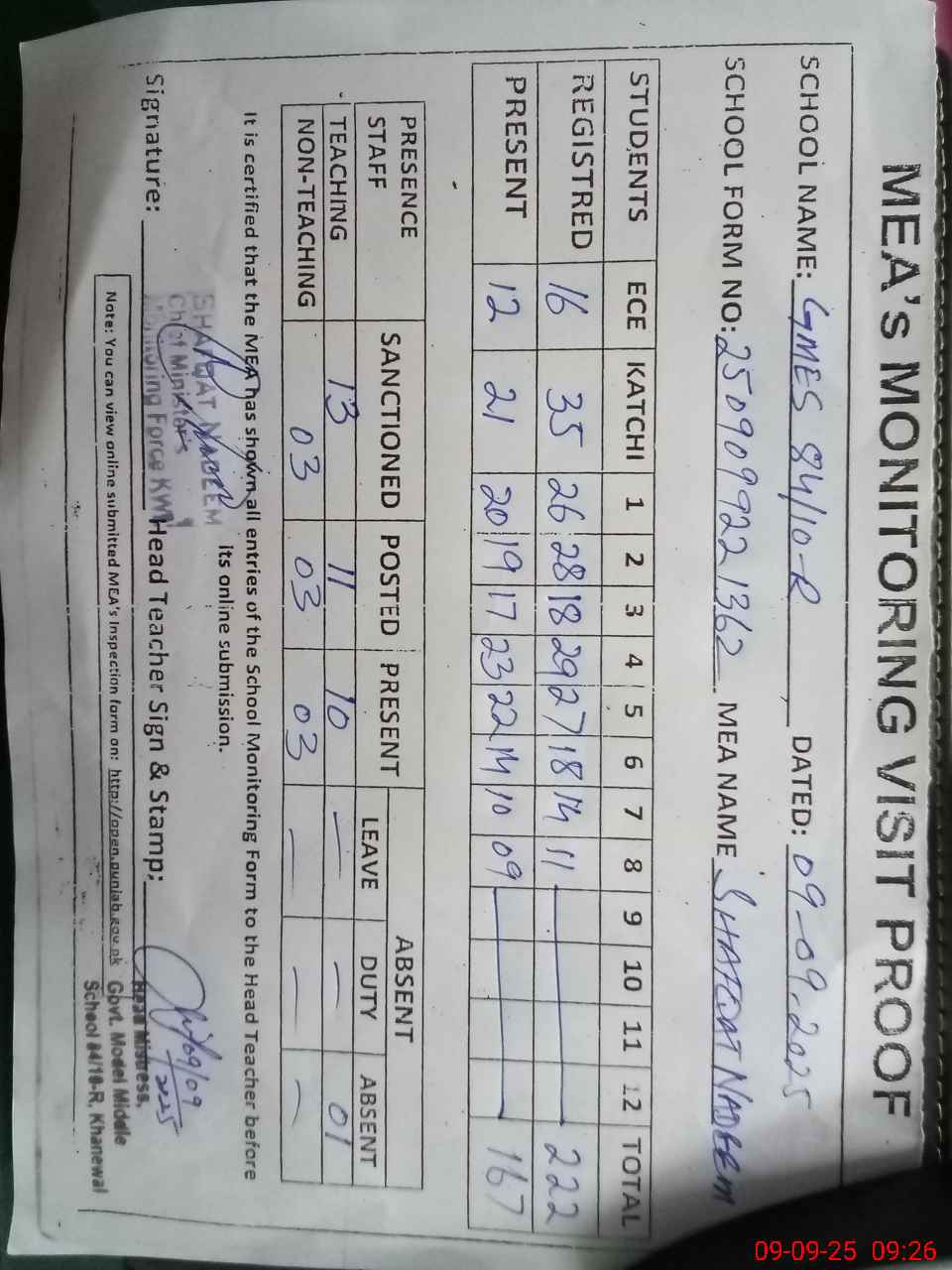 | EMIS Code: 36420426 | Name of School: GMES 84/10-R, KHANEWAL | |||