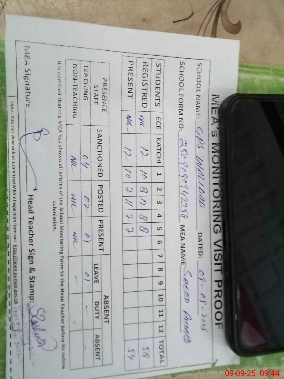 | Attendance Register | Head Teacher | MEA with School | Visit Proof |