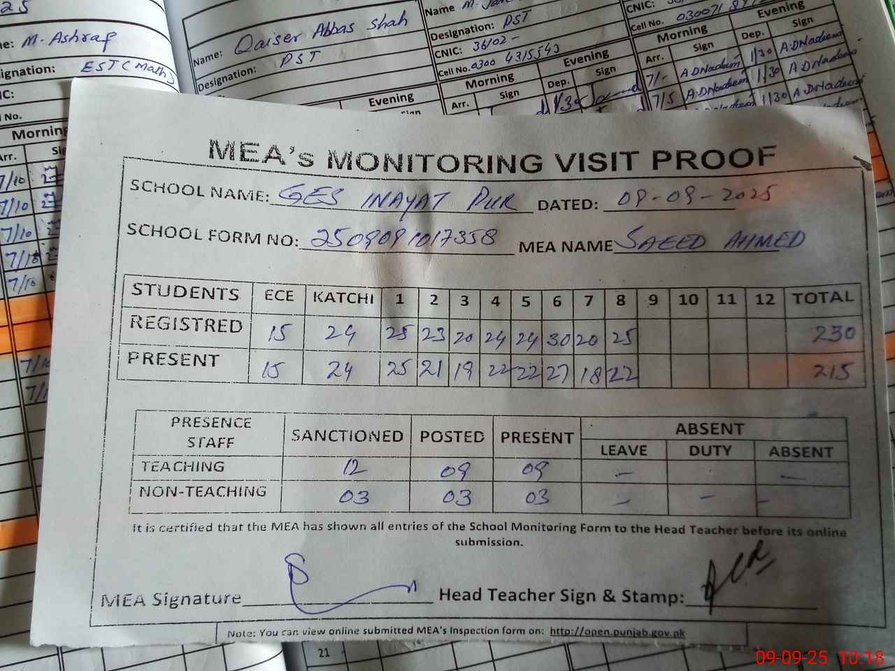 | EMIS Code: 36410055 | Name of School: GES INAYAT PUR, P/O HAJI PUR, KABIRWALA | |||