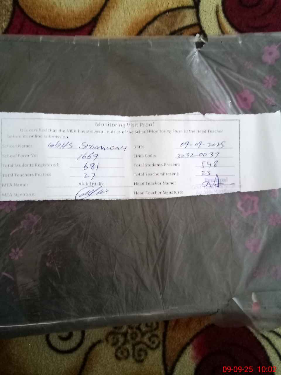 | Attendance Register | Head Teacher | MEA with School | Visit Proof |