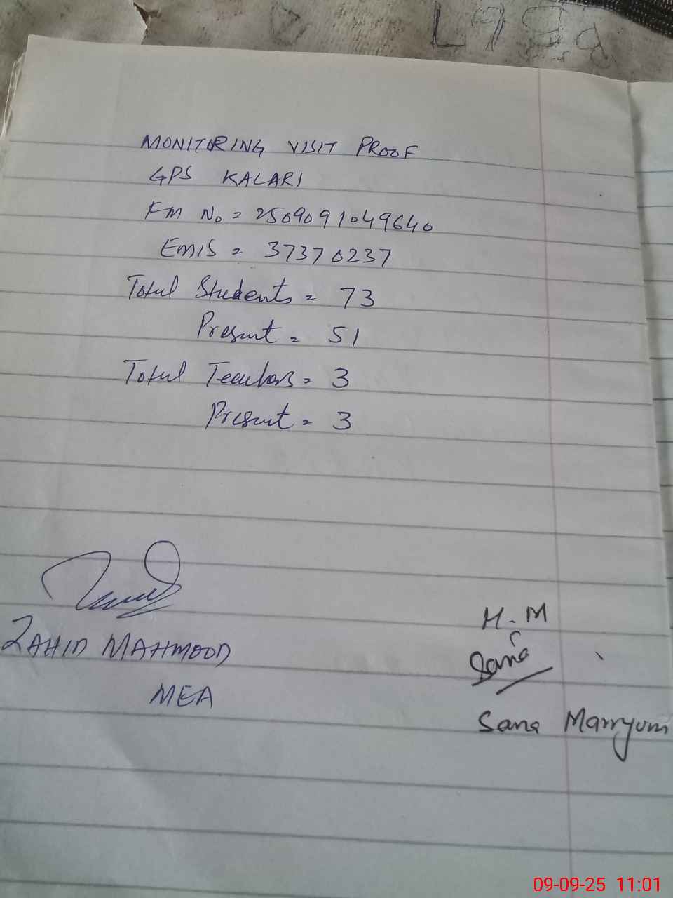 | Monitoring Date: 09-09-2025 | Start Time: 09-09-2025 10:46 AM | End Time: 09-09-2025 11:03 AM | Name of MEA: Za**** Me**** | |