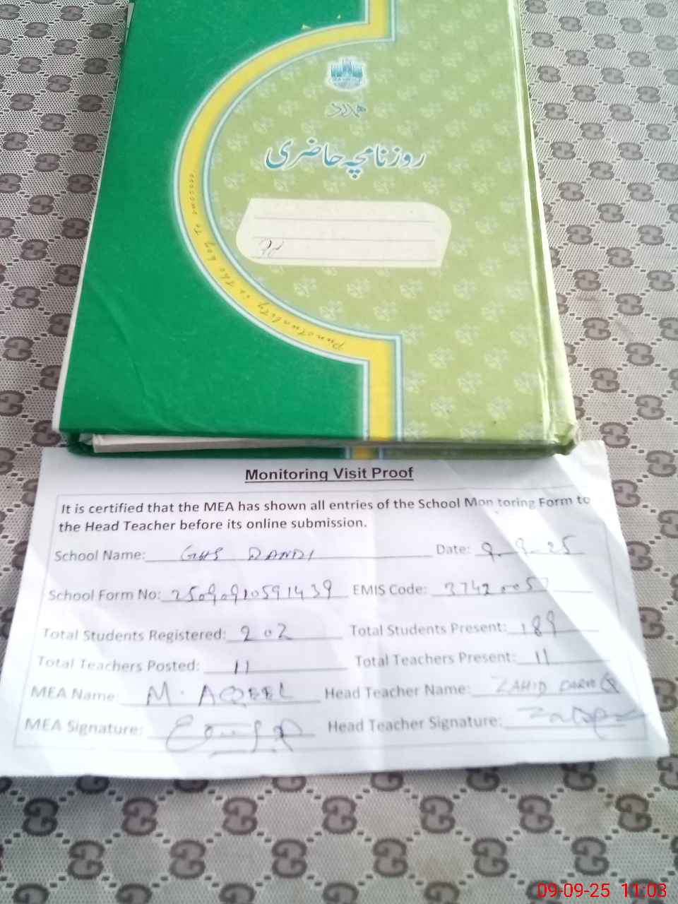 | Attendance Register | Head Teacher | MEA with School | Visit Proof |