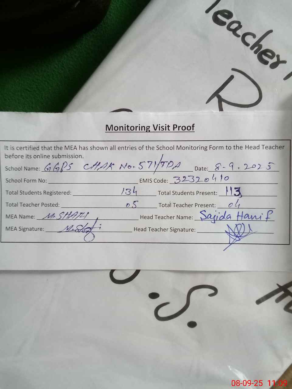 | Attendance Register | Head Teacher | MEA with School | Visit Proof |