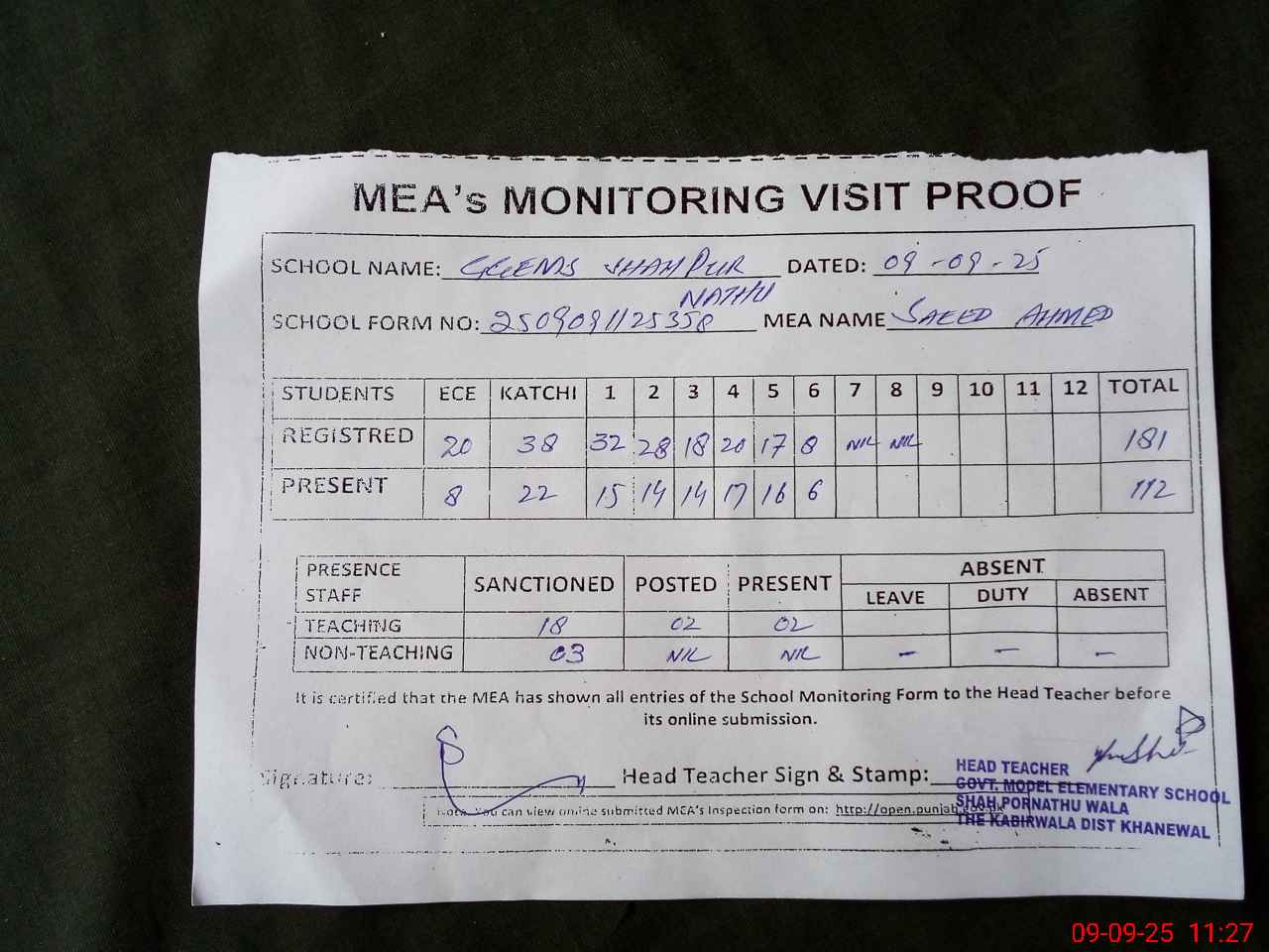 | Attendance Register | Head Teacher | MEA with School | Visit Proof |