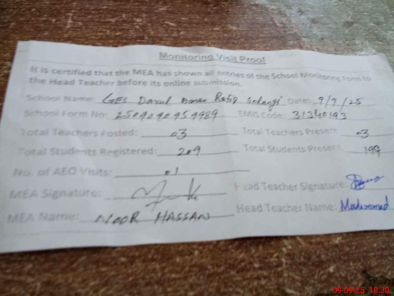 | Attendance Register | Head Teacher | MEA with School | Visit Proof |