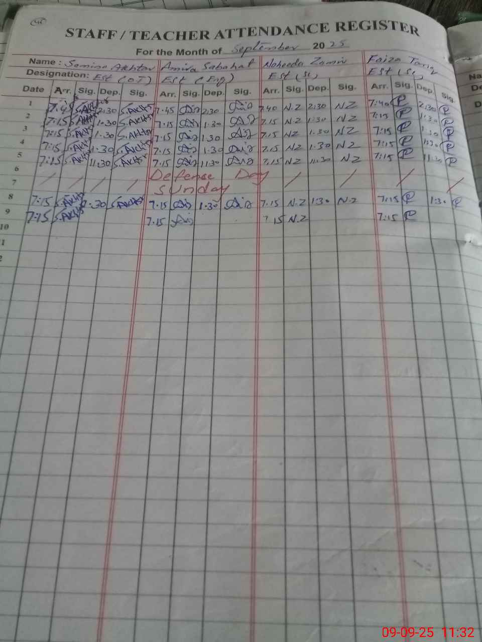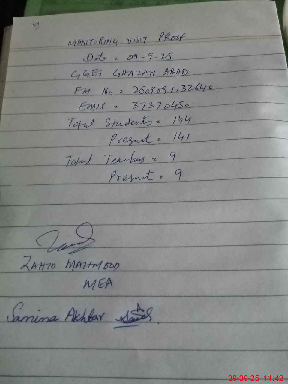 | Monitoring Date: 09-09-2025 | Start Time: 09-09-2025 11:19 AM | End Time: 09-09-2025 11:44 AM | Name of MEA: Za**** Me**** | |