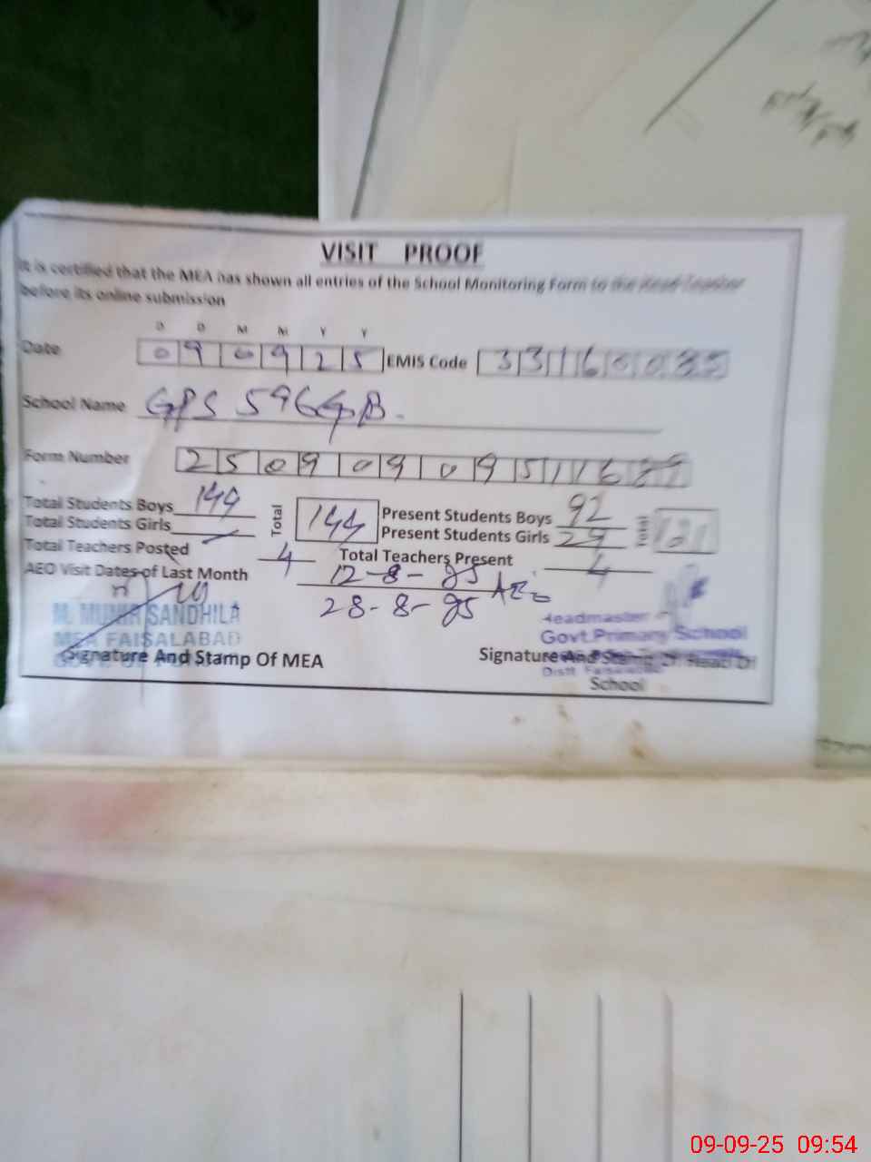 | Attendance Register | Head Teacher | MEA with School | Visit Proof |