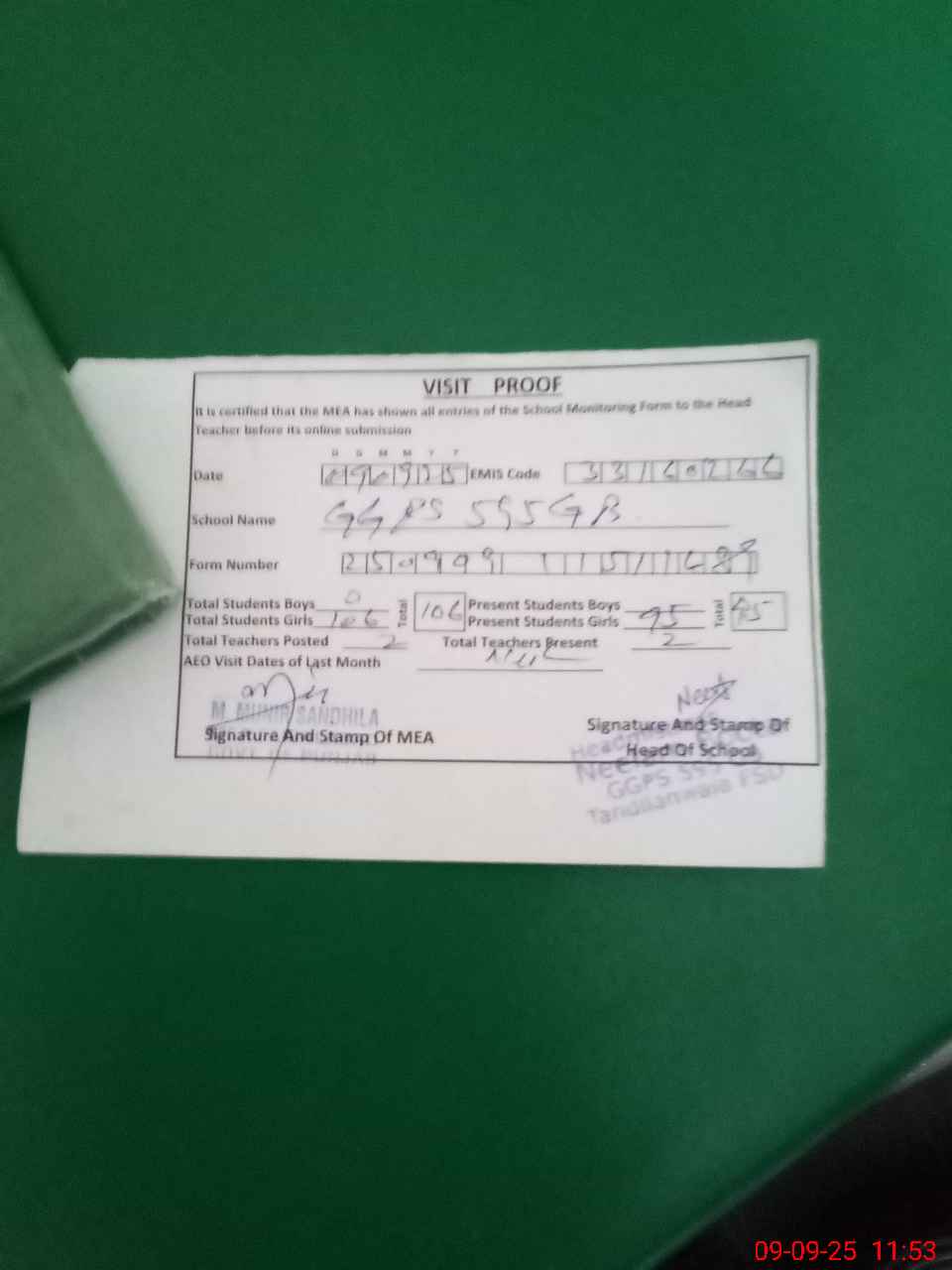 | Attendance Register | Head Teacher | MEA with School | Visit Proof |