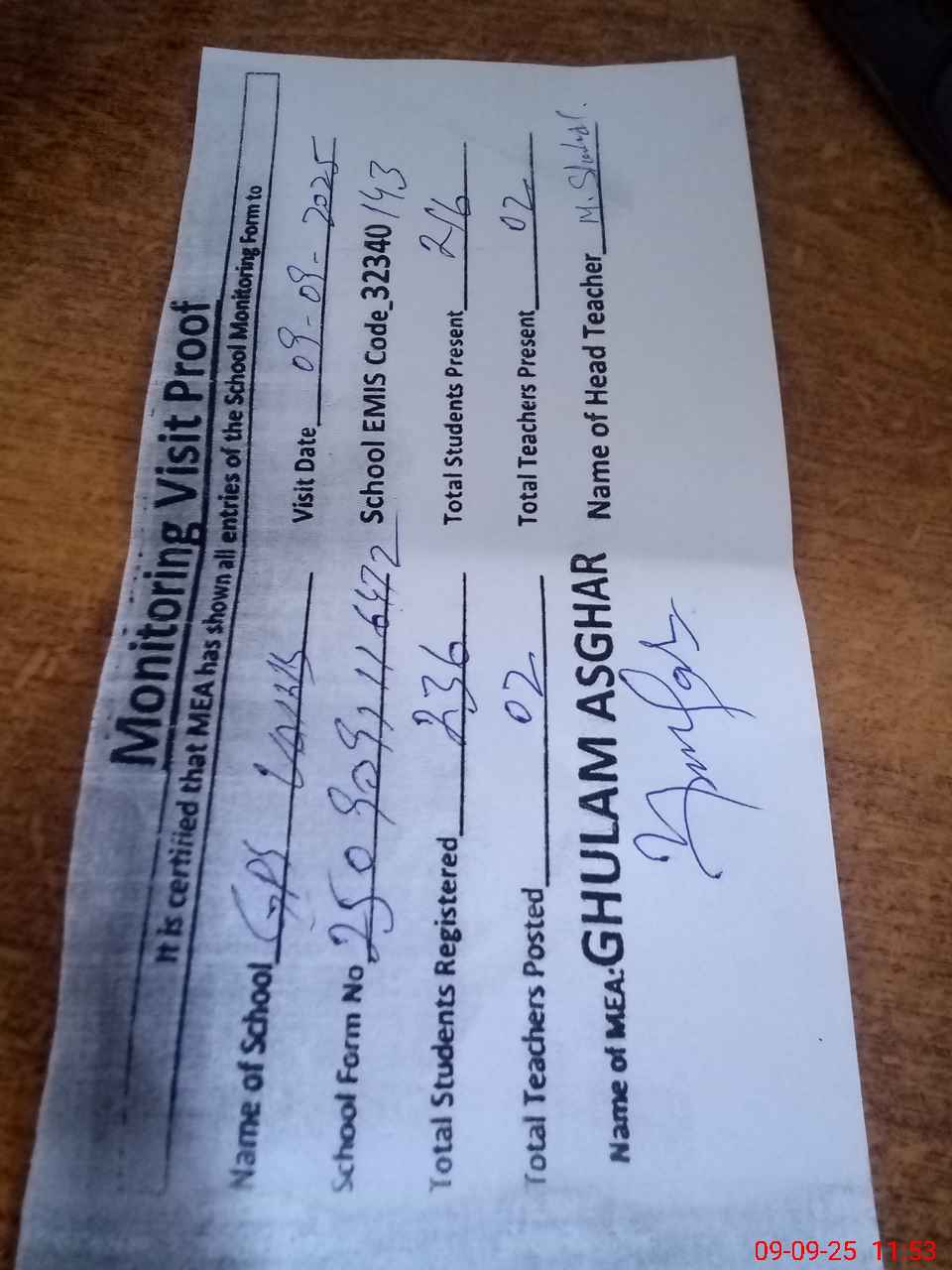 | Attendance Register | Head Teacher | MEA with School | Visit Proof |