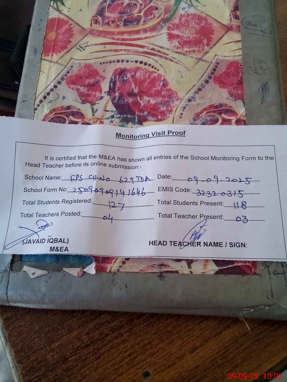 | EMIS Code: 32320315 | Name of School: GPS CHAK NO. 629/TDA | |||