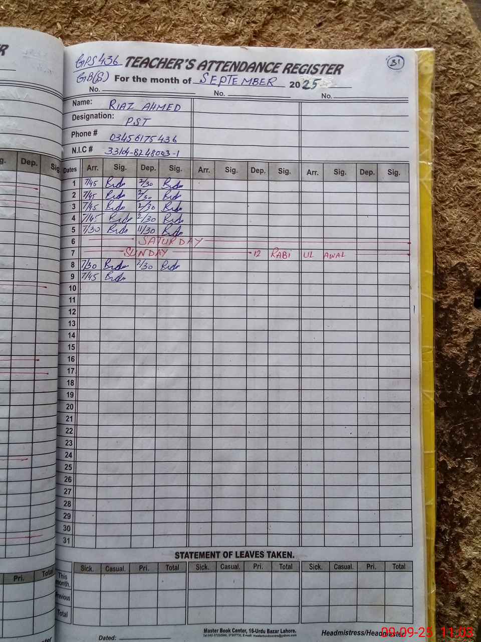 | Name: RI**** AH**** Designation: (School Headmaster's/Headmistress's) ESE Phone/Cell Number: 03**** |