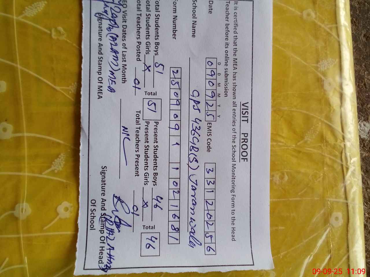 | Attendance Register | Head Teacher | MEA with School | Visit Proof |