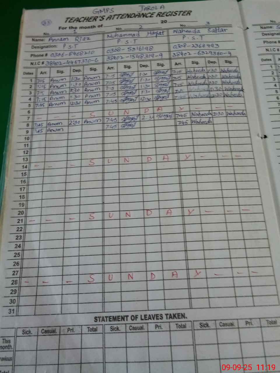 | CNIC | Full Name | Designation | R/C | Absence During Last Calender Month |