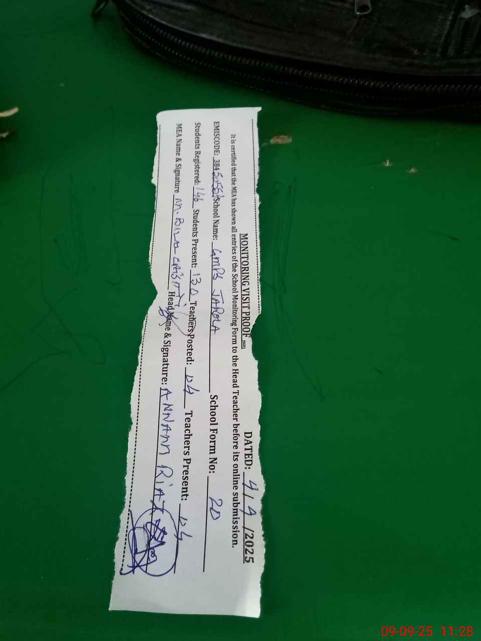 | Attendance Register | Head Teacher | MEA with School | Visit Proof |