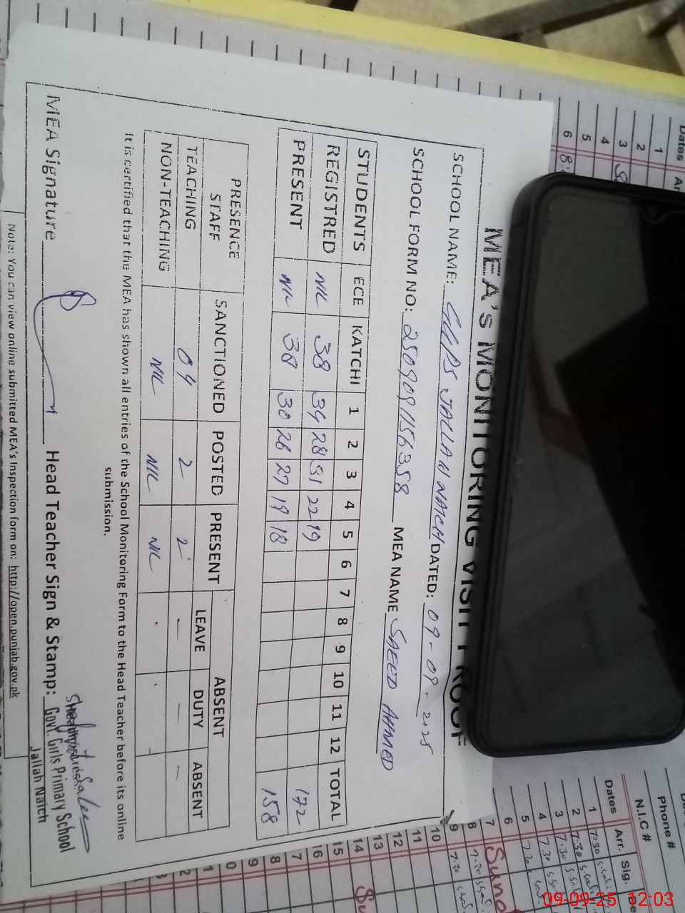 | Attendance Register | Head Teacher | MEA with School | Visit Proof |
