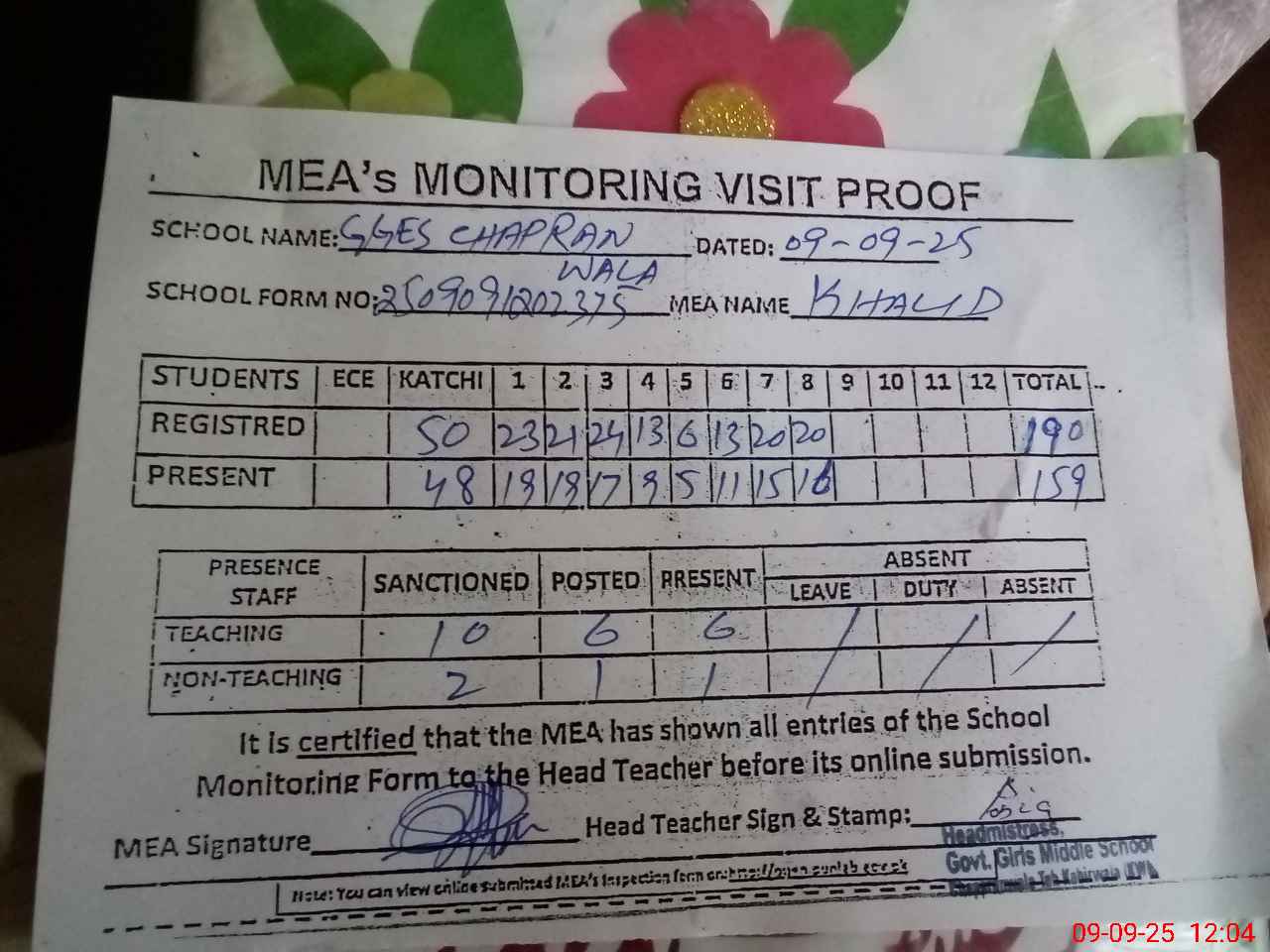 | Attendance Register | Head Teacher | MEA with School | Visit Proof |