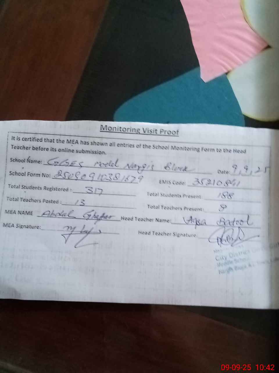 | EMIS Code: 35210841 | Name of School: GGES MODEL NARGIS BLOCK IQBAL TOWN (EX-MCL) | |||