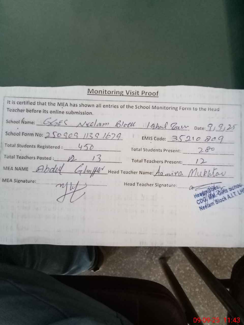 | EMIS Code: 35210809 | Name of School: GGES NEELAM BLOCK IQBAL TOWN (EX-MCL) | |||