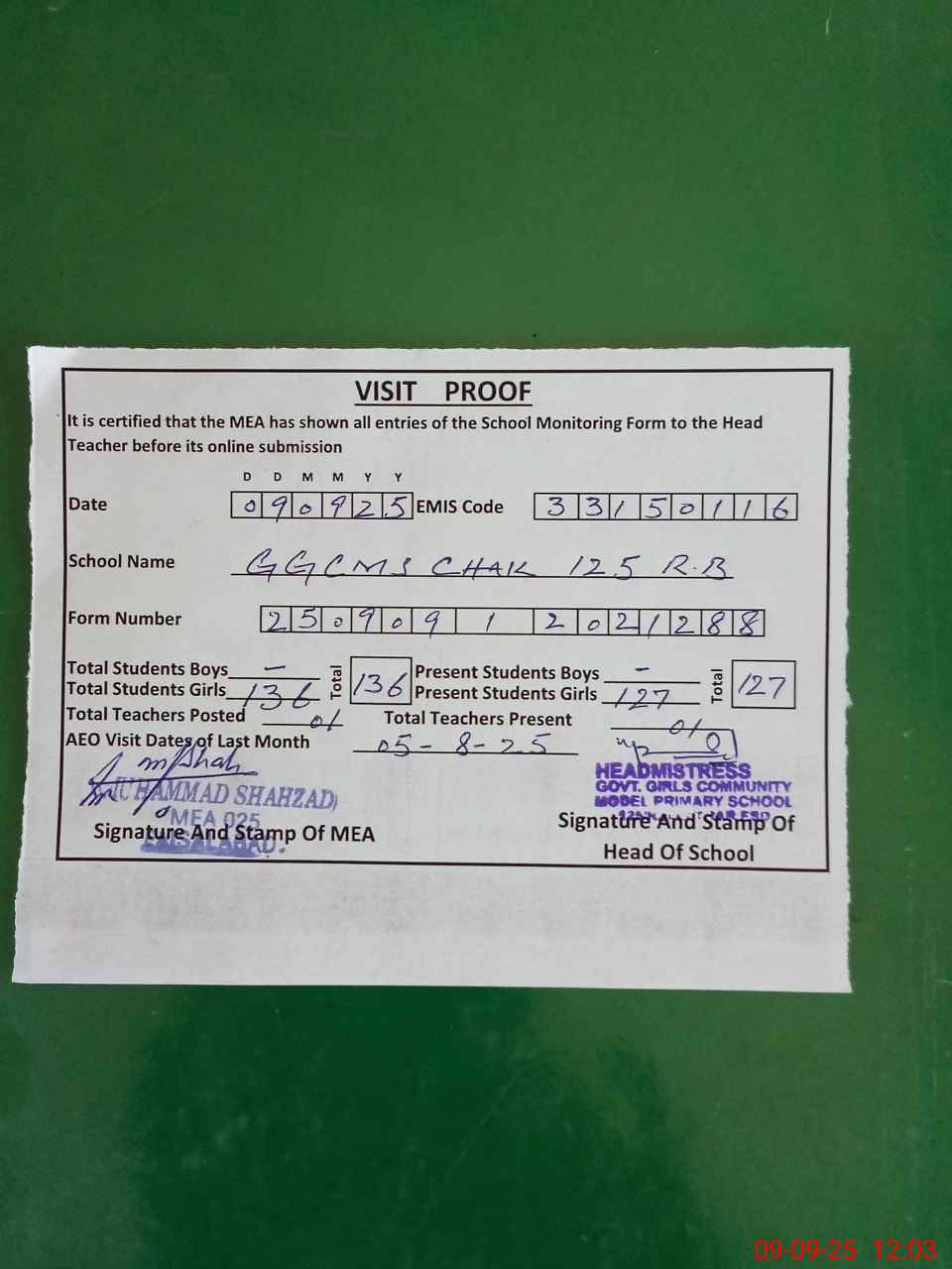 | EMIS Code: 33150116 | Name of School: GGCMS CHAK 125 RB | |||