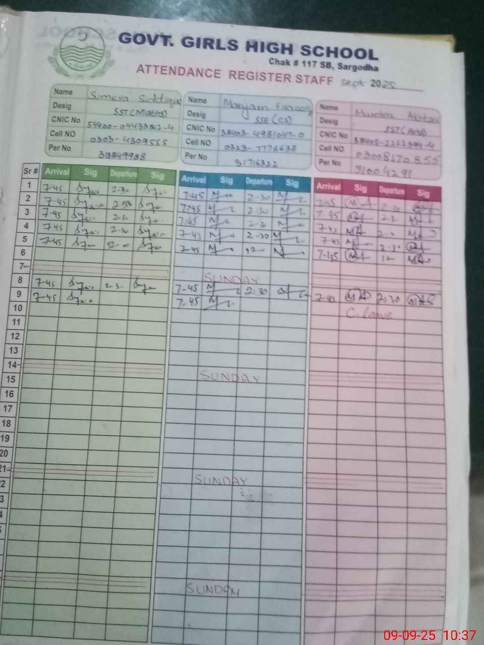 | CNIC | Full Name | Designation | R/C | Absence during last cal. month |