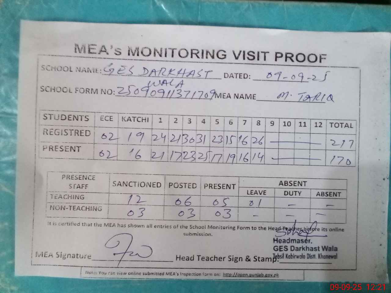| Attendance Register | Head Teacher | MEA with School | Visit Proof |