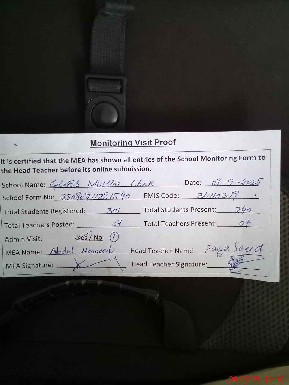 | Attendance Register | Head Teacher | MEA with School | Visit Proof |