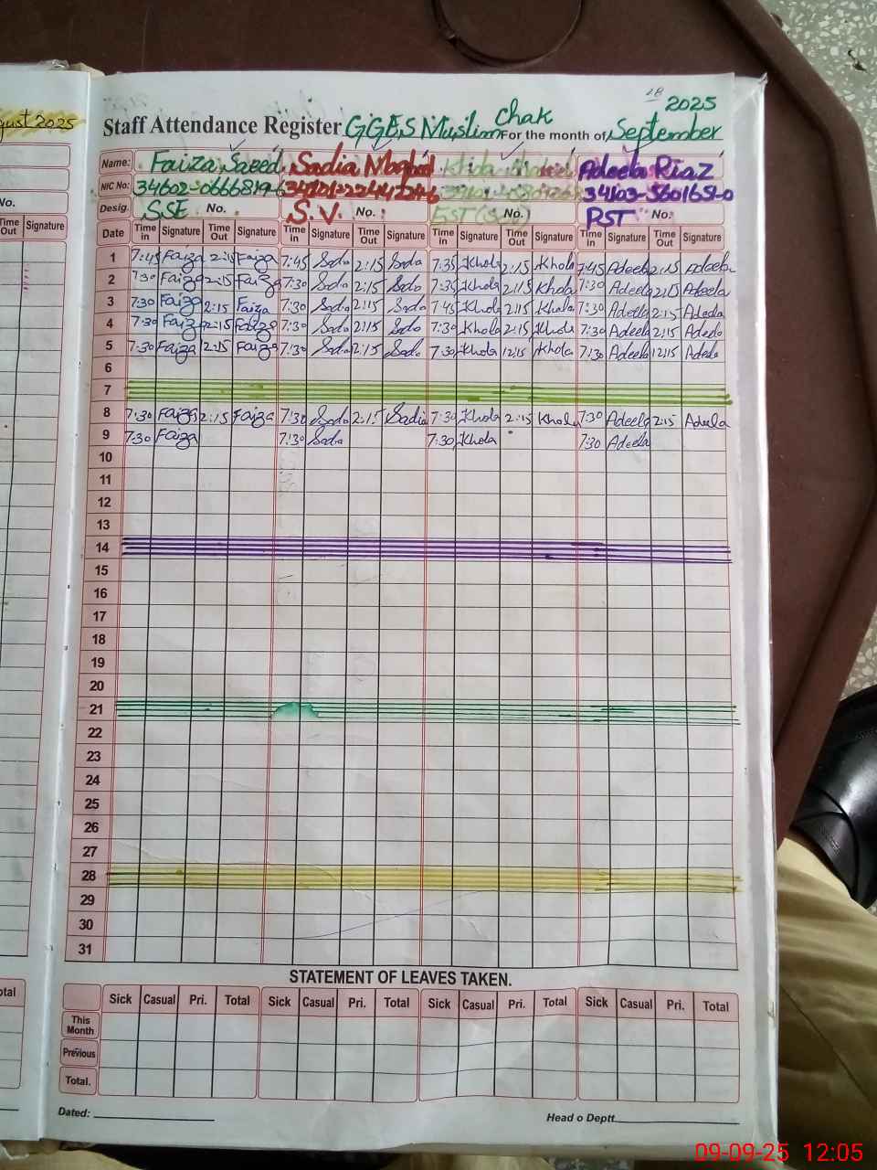 | CNIC | Full Name | Designation | R/C | Absence during last cal. month |